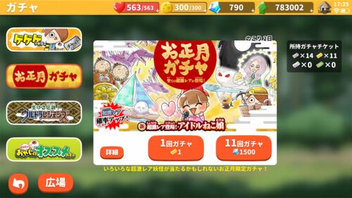 家庭があると正月休みのほうがゲームができなかったりするものです。 ただ、ログインボーナスだけはもらってました。 お正月ガチャも引いてみたので、その結果だけ記しておきたいと思います。 レアチケット11枚を消費して超激レアは1体のみ。 しかもまたして…